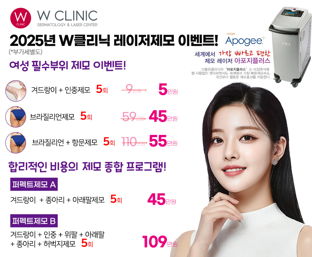 아포지플러스 레이저를 이용한 선진국 트랜드의 레이저제모- 브라질리언, 항문제모, 겨드랑이, 팔다리제모 등 제모클리닉을 선도하는 뛰어난 시술을 만나보세요.